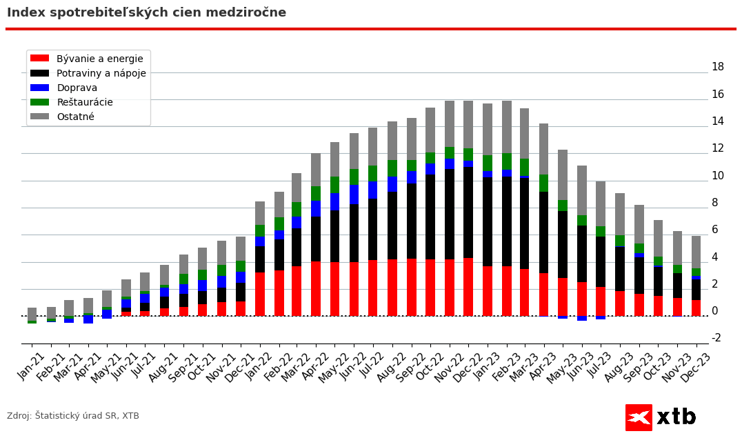 Poesledný mesiac december uzatvára vývoj indexu spotrebiteľských cien a teda aj inflačný vývoj. Medziročná inflácia bola v mesiaci december na úrovni 5,9 %. Najvýznamnejšie nám v tomto roku rástli náklady na vzdelanie, a to o14.7 %. Významnejšie rástli aj ceny v zdravotníctve, o 10,1 %, ceny v reštauráciách, o 9,5 % a ceny alkoholu a tabakových výrobkov, o 8 %.