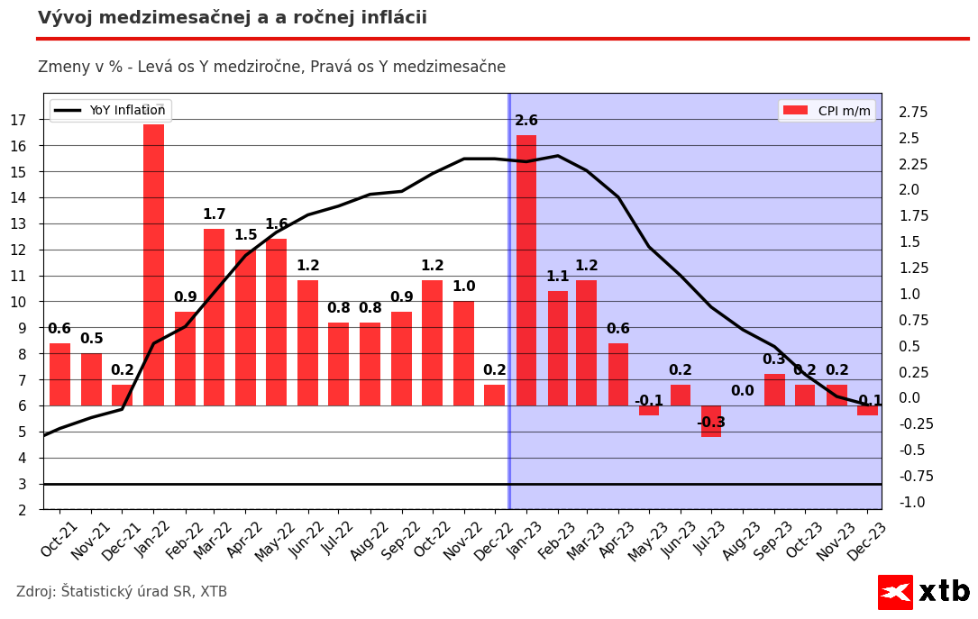 Keď sa pozrieme na medzimesačný vývoj, tak v decembri nám ceny poklesli o 0,1 %, pričom výraznejší pokles sme videli hlavne v sekcii dopravy, ktorá klesala o 2 % z dôvodu nižších cien palív, a z dôvodu poklesu cien potravín o 0,2 %. Ceny vo zvyšku segmentov takmer stagnovali. Medzimesačne nám v tomto roku ceny rástli iba v začiatku, teda v pvých 4 mesiacoch, keďže v začiatku roku podniky častokrát preceňujú svoje produkty a služby na základe dát z minulého roka. Väčšina inflácie sa tak pravidelne udeje v januári, a tak si budeme musieť počkať na súčasný január aby sme vedeli, ako na tom bude inflácia v tomto roku. To, či väčšiu infláciu uvidíme v nasledujúcom roku tak určí práve tento mesiac.