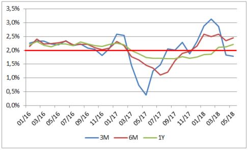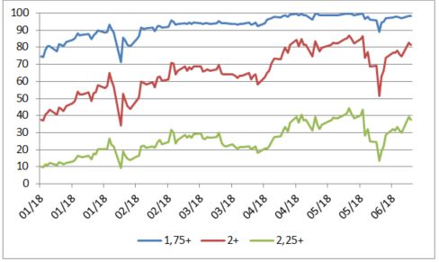 Pokiaľ by jadrová inflácia ostala nad dvoma percentami aj v najbližších mesiacoch, tak ešte existuje priestor pre ďalšie pozitívne prekvapenia. Trhy sa síce už spamätali z talianskeho šoku, stále však ešte úplne nezapočítali ani možnosť dvoch zvýšení sadzieb do konca roka (aktuálne jej prideľujú pravdepodobnosť 80%) a zatiaľ príliš nepočítajú s troma ďalšími zvýšeniami (pravdepodobnosť pod 40%), ktoré sa nejavia byť nereálne.
