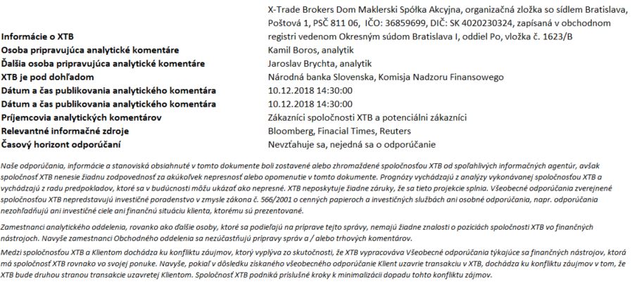 Tento materiál je marketingovou komunikáciou v zmysle čl. 24 ods. 3 smernice Európskeho parlamentu a Rady 2014/65/EÚ z 15. mája 2014 o trhoch s finančnými nástrojmi, ktorou sa mení smernica 2002/92/ES a smernica 2011/61/EÚ (MiFID II). Marketingová komunikácia nie je investičným odporúčaním ani informáciou odporúčajúcou alebo navrhujúcou investičnú stratégiu v zmysle nariadenia Európskeho parlamentu a Rady (EÚ) č. 596/2014 zo 16. apríla 2014 o zneužívaní trhu (nariadenie o zneužívaní trhu) a o zrušení smernice Európskeho parlamentu a Rady 2003/6/ES a smerníc Komisie 2003/124/ES, 2003/125/ES a 2004/72/ES a delegovaného nariadenia Komisie (EÚ) 2016/958 z 9. marca 2016, ktorým sa dopĺňa nariadenie Európskeho parlamentu a Rady (EÚ) č. 596/2014, pokiaľ ide o regulačné technické predpisy upravujúce technické opatrenia na objektívnu prezentáciu investičných odporúčaní alebo iných informácií, ktorými sa odporúča alebo navrhuje investičná stratégia, a na zverejňovanie osobitných záujmov alebo uvádzanie konfliktov záujmov v zmysle zákona č. 566/2001 Z. z. o cenných papieroch a investičných službách. Marketingová komunikácia je pripravená s najvyššou starostlivosťou, objektivitou, prezentuje fakty známe autorovi k dátumu prípravy a neobsahuje žiadne hodnotiace prvky. Marketingová komunikácia je pripravená bez zohľadnenia potrieb klienta, jeho individuálnej finančnej situácie a nijakým spôsobom nepredstavuje investičnú stratégiu. Marketingová komunikácia nepredstavuje ponuku na predaj, ponuku, predplatné, výzvu na nákup, reklamu alebo propagáciu akýchkoľvek finančných nástrojov. XTB S.A. organizačná zložka nezodpovedá za žiadne kroky alebo opomenutia klienta, najmä za nadobudnutie alebo predaj finančných nástrojov. XTB nezodpovedá za žiadnu stratu alebo škodu, vrátane, bez obmedzenia, akejkoľvek straty, ktorá môže vzniknúť priamo alebo nepriamo, spôsobená na základe informácií obsiahnutých v tejto marketingovej komunikácii. V prípade, že marketingová komunikácia obsahuje akékoľvek informácie o akýchkoľvek výsledkoch týkajúcich sa finančných nástrojov v nej uvedených, nepredstavujú žiadnu záruku ani prognózu budúcich výsledkov. Minulá výkonnosť nemusí nevyhnutne naznačovať budúce výsledky a každá osoba konajúca na základe týchto informácií tak robí výlučne na vlastné riziko.