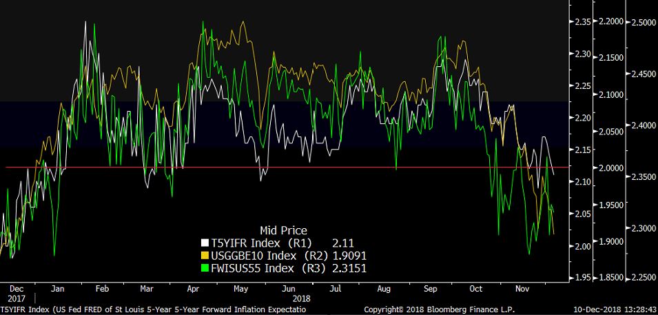 FED má o dôvod viac dať si pri zvyšovaní sadzieb pauzu. Popri zlej nálade na finančných trhoch a relatívne silnom ochladzovaní sa trhu s bývaním padajú aj inflačné očakávania. Všetky tri miery inflačných očakávaní (ktoré ich merajú každý deň) – výnosy z 10 ročných inflačných dlhopisov, 5r/5r inflačný swap a 5/5r index inflačných očakávaní z dielne FEDu, sú aktuálne na úrovniach, kde sa naposledy dlhodobejšie držali pred rokom.