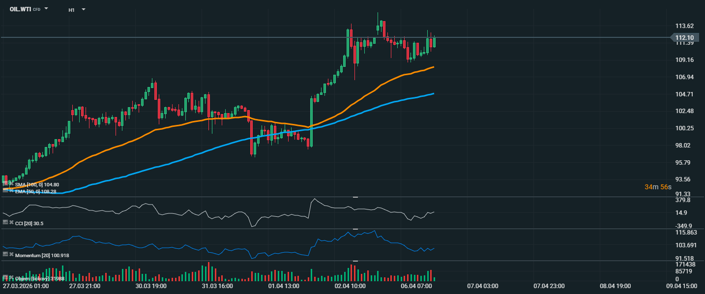 Cena americkej ropy WTI sa aktuálne pohybuje okolo 112,10 USD a po predchádzajúcom prudkom raste zatiaľ drží zisky v blízkosti lokálnych maxím. Trh sa naďalej obchoduje výrazne nad kĺzavými priemermi EMA 50 na 108,28 USD aj SMA 100 na 104,80 USD, čo potvrdzuje pokračujúci býčí trend. Po silnom impulze z prelomu minulého týždňa prešla ropa do krátkodobej konsolidácie, no aj tá zatiaľ pôsobí skôr ako oddych pred ďalším pohybom než ako znak obratu.
