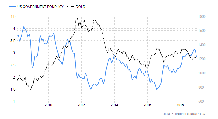 Inverzní korelace mezi cenami zlata a výnosy z desetiletých dluhopisů je velmi dobrá. Zdroj: TradingEconomics