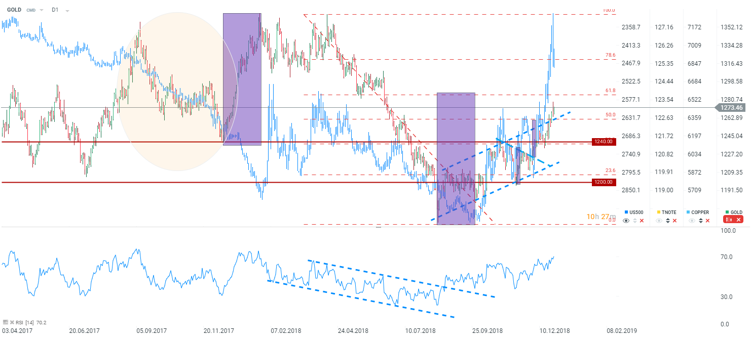 Zlato bylo v průběhu roku 2018 silně přeprodáno. Bylo to poprvé po mnoha letech, kdy jsme byli svědky negativních net-pozic velkých spekulantů (více sázek na shorty než na longy). Zároveň ETF fondy vyprodávaly svoje rezervy. Tato situace nicméně nemohla trvat věčně. Americký dolar začal ztrácet lesk a investoři se začali sázek na short zbavovat. Odraz long pozic by mohl být dalším výrazným signálem, že má žlutý kov to nejhorší za sebou.