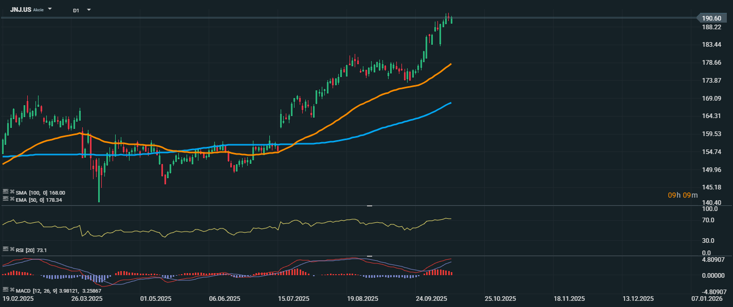 Akcie spoločnosti Johnson & Johnson sa aktuálne obchodujú na úrovni 190,60 USD. Akcie sa nachádzajú v jasnom býčom trende, čo potvrdzujú rastúce kĺzavé priemery EMA 50 (178,34 USD) a SMA 100 (168,00 USD), od ktorých sa cena v predchádzajúcich týždňoch niekoľkokrát odrazila. RSI sa vyšplhal na 73,1, čo naznačuje vstup do prekúpenej zóny – môže to signalizovať krátkodobú korekciu alebo spomalenie rastu, no zatiaľ nebol potvrdený technický obrat.