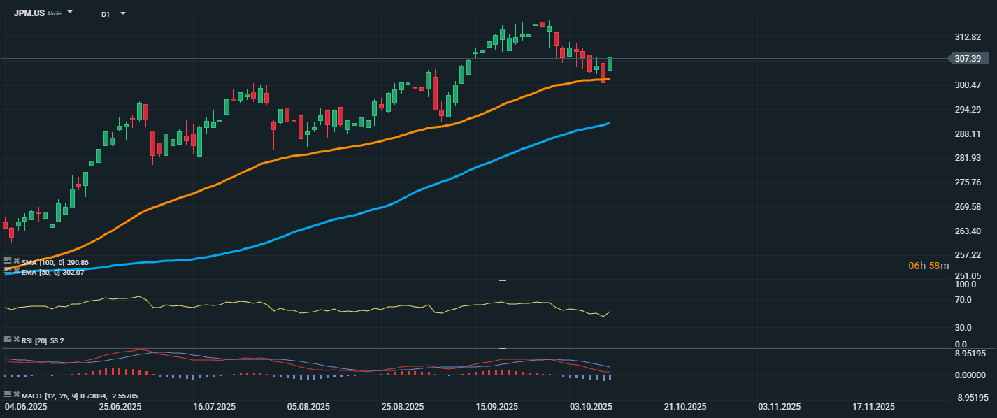 Akcie JPMorgan Chase sa aktuálne obchodujú na úrovni 307,39 USD a po krátkodobom oslabení našli podporu na úrovni 50-dňového kĺzavého priemeru EMA (302,07 USD). Tento odraz naznačuje, že býci zatiaľ udržiavajú kontrolu nad trhom. Dlhodobý SMA 100 (290,86 USD) sa stále nachádza hlboko pod aktuálnou cenou, čo potvrdzuje stabilný rastový trend.