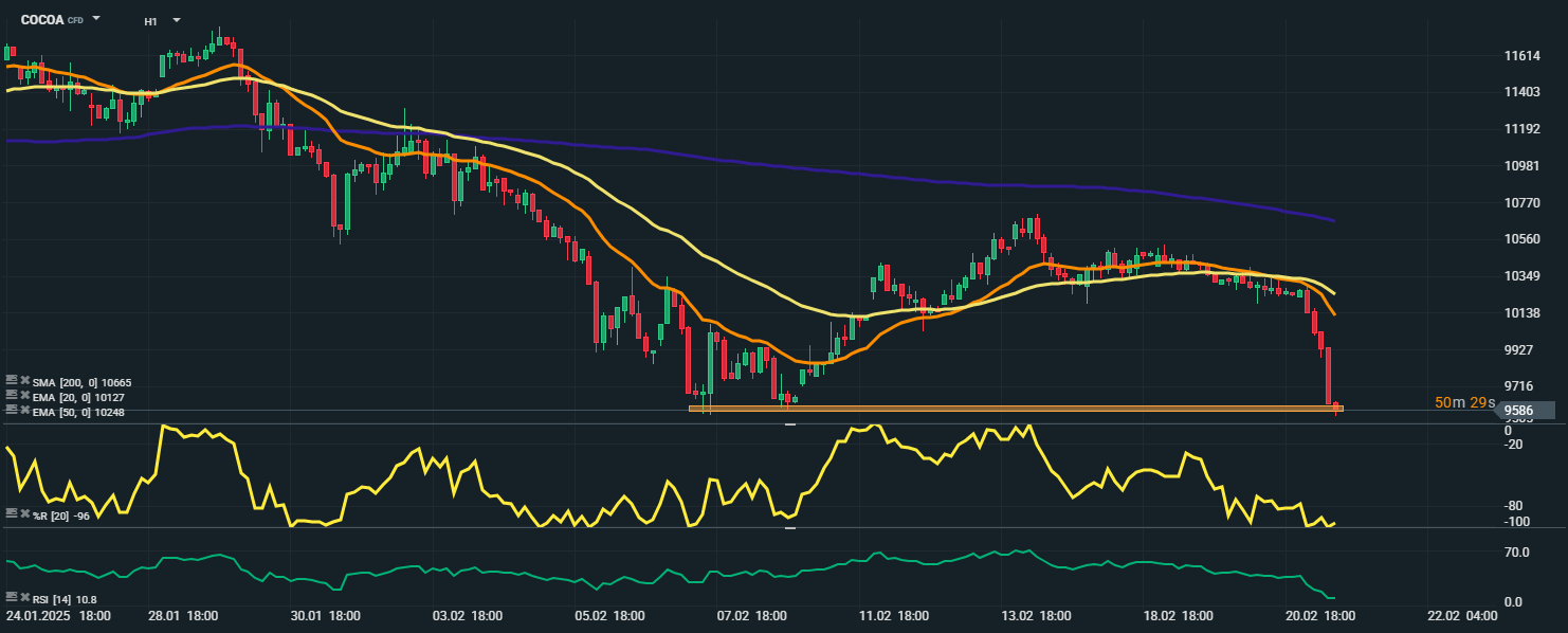 Podľa grafu H1 kakao prudko kleslo na 9 540 $, čo zodpovedá kritickej úrovni podpory zo 7. februára. EMA 20 prerazila zhora nadol EMA 50, čo potvrdzuje pokračujúci medvedí trend. SMA 200 je ďaleko nad súčasnou cenou, čo poukazuje na dlhodobý medvedí sentiment.