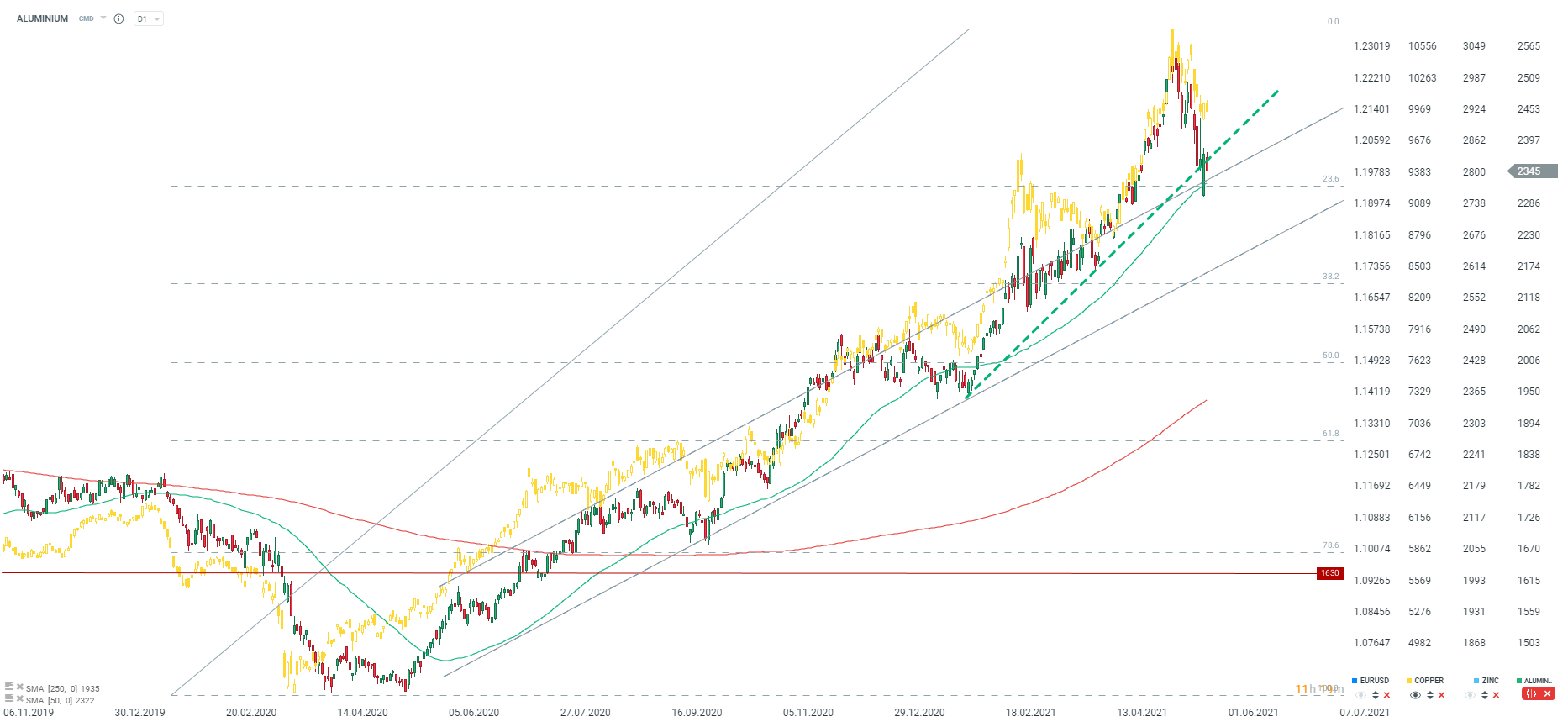Cena hliníka je podporovaná 23,6 Fibonacciho retracementom, ktorý sa zase zhoduje s hornou hranicou stúpajúceho kanála a kĺzavým priemerom s periódou 50. Na druhej strane, stúpajúca trendová čiara bola nedávno prekročená. Ak dôjde k porušeniu spomínanej podpory, ďalšia pre predajcov sa nachádza okolo 2 200 - 2 250 dolárov za tonu. Na druhej strane, býci môžu znovu získať kontrolu, až keď cena vzrastie nad úroveň 2370 USD. Zdroj: xStation5