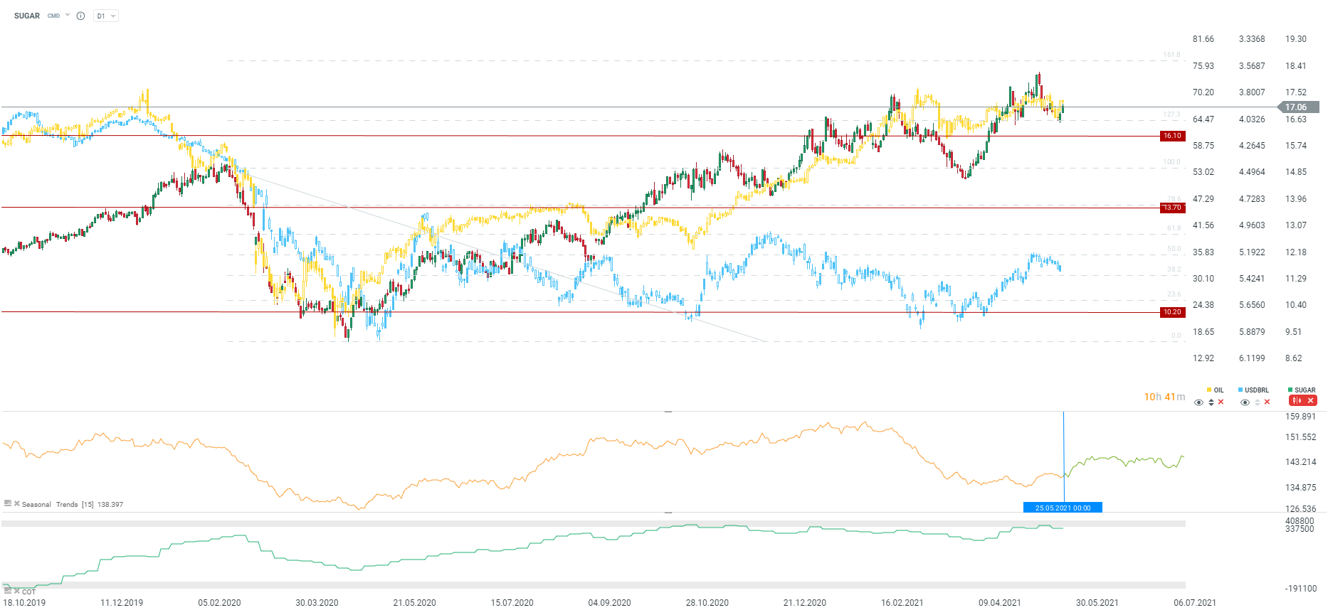 Cena cukru je v súčasnosti podporovaná oživením cien ropy. V súčasnosti je cena väčšiny základných faktorov ovplyvnená, takže budúce ceny ropy a dolára môžu byť pre cenu tejto komodity kľúčové. Zdroj: xStation5