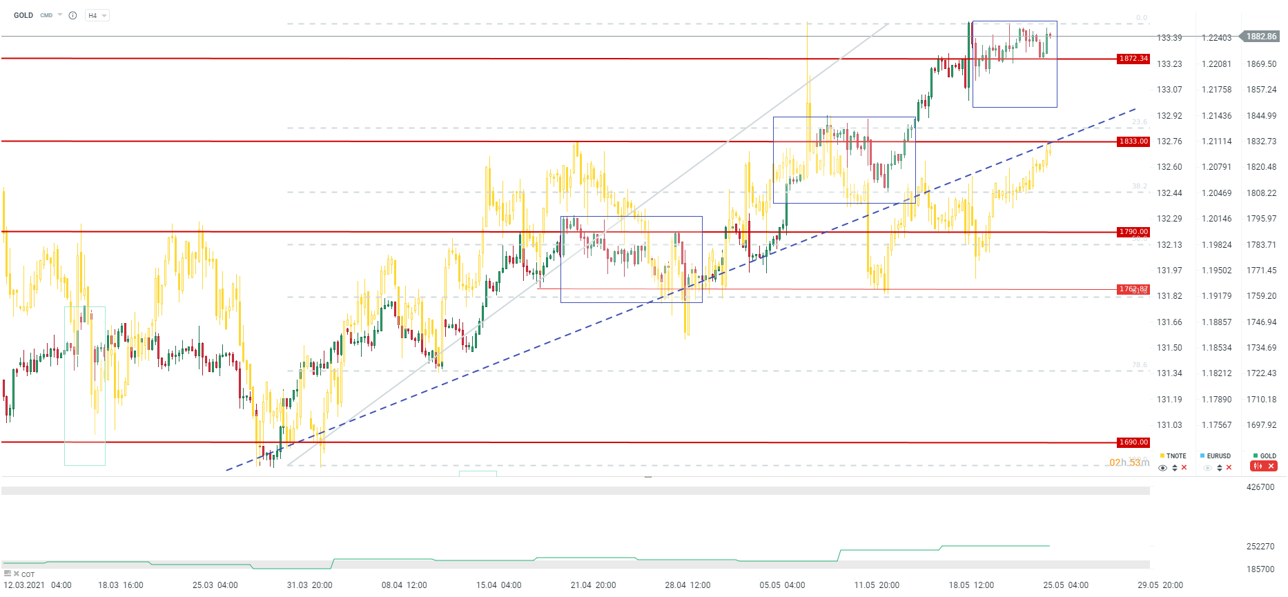 Zlato sa konsoliduje pod hladinou 1 890 dolárov za uncu. Najdôležitejšia podpora sa nachádza okolo 1 850 dolárov za uncu a je označená spodnou hranicou štruktúry Overbalance a 23,6 Fibonacciho retracementom. Zdroj: xStation5