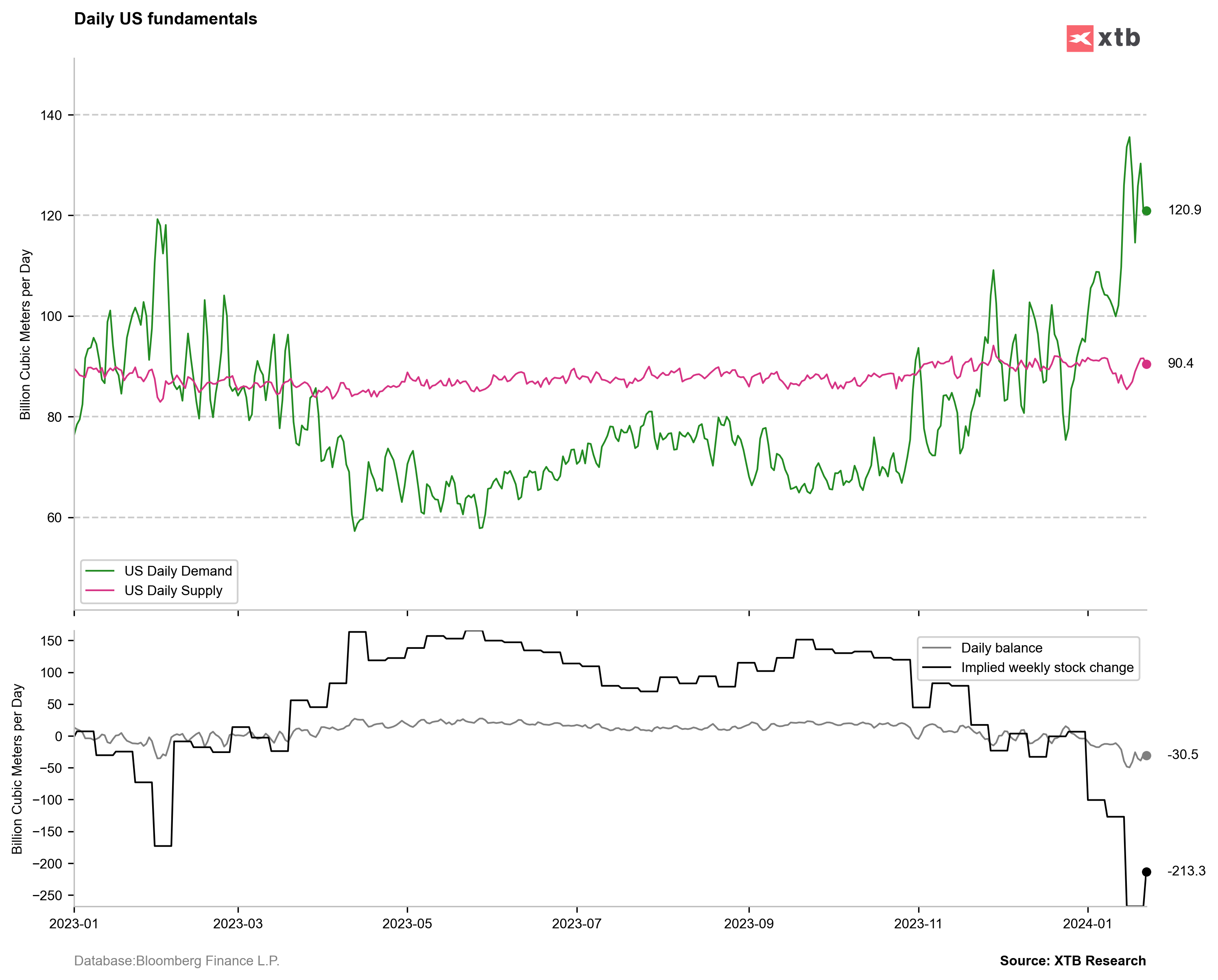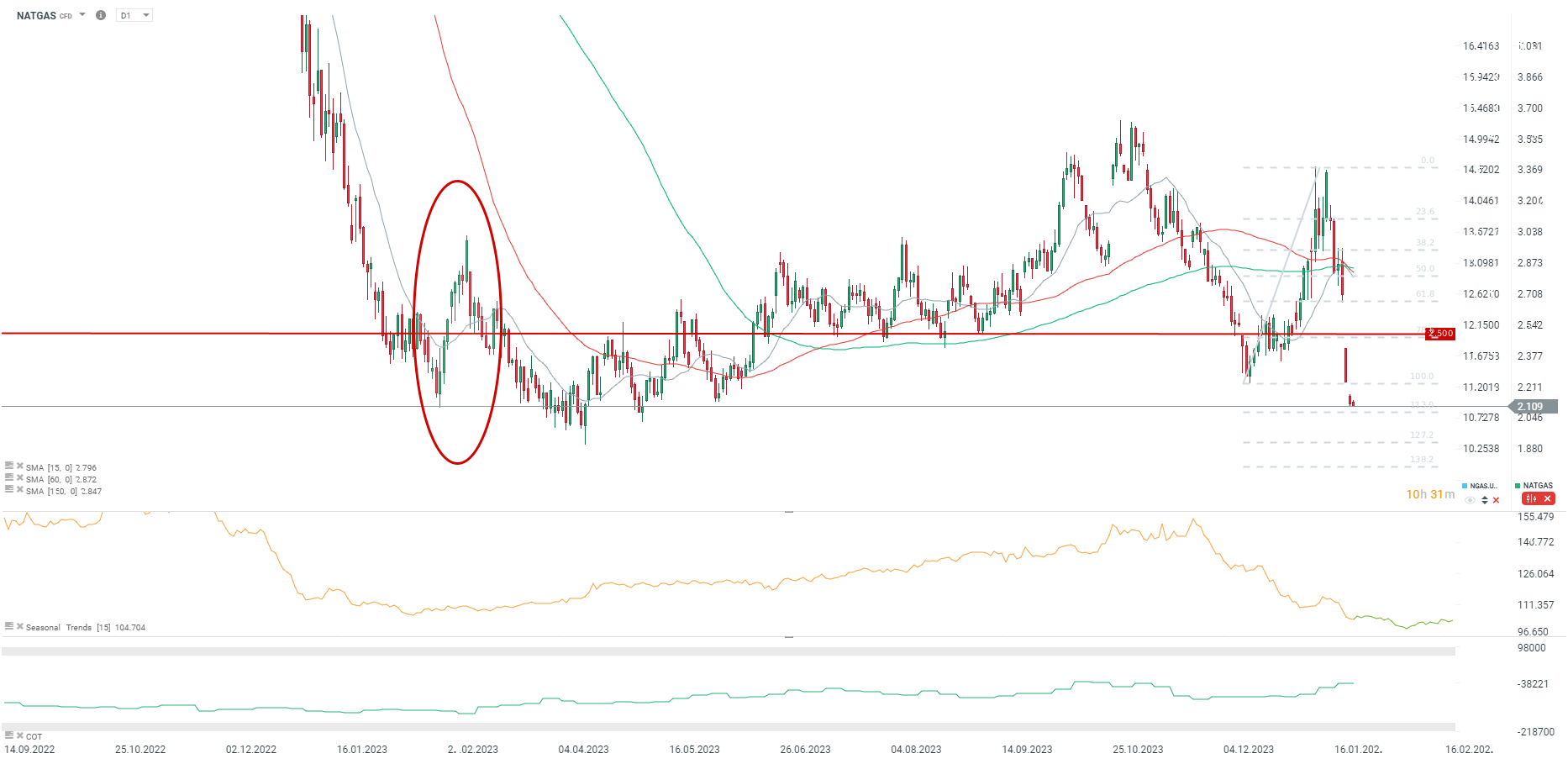 Cena sa nachádza na najbližšej úrovni od apríla minulého roka. Vlani sa tlak na pokles skončil v polovici februára, po ktorom sme boli svedkami 40 %-ného nárastu ceny, ktorý sa nakoniec skončil pokračovaním poklesu pod úroveň 2 USD/MMBTU. Nedá sa vylúčiť, že cena začne konsolidovať v blízkosti úrovne 2 USD/MMBTU a počká na ďalšie informácie o dopyte a ponuke plynu v USA, ktoré budú do veľkej miery závisieť od počasia. Zdroj: xStation5