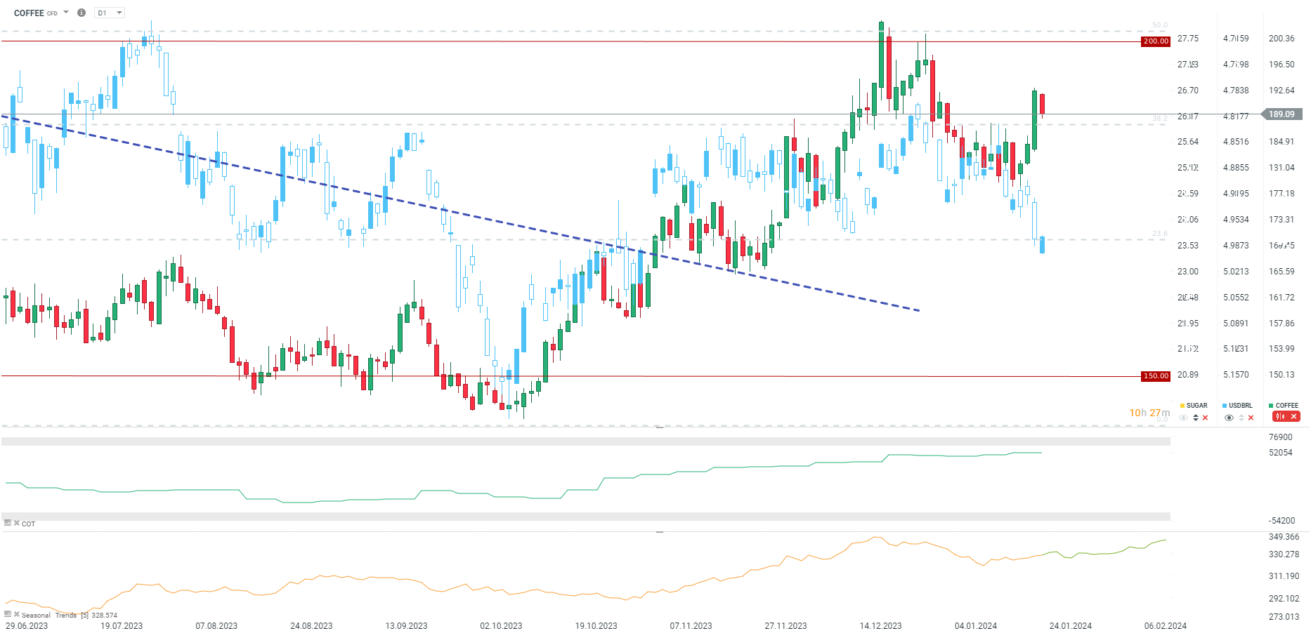 Cena kávy obmedzuje silný rast cien z posledných niekoľkých seáns. Zaujímavé je, že pozorujeme oslabenie brazílskeho realu, čo naznačuje, že ceny sa vrátili pod 180 centov za libru. Zdroj: xStation5