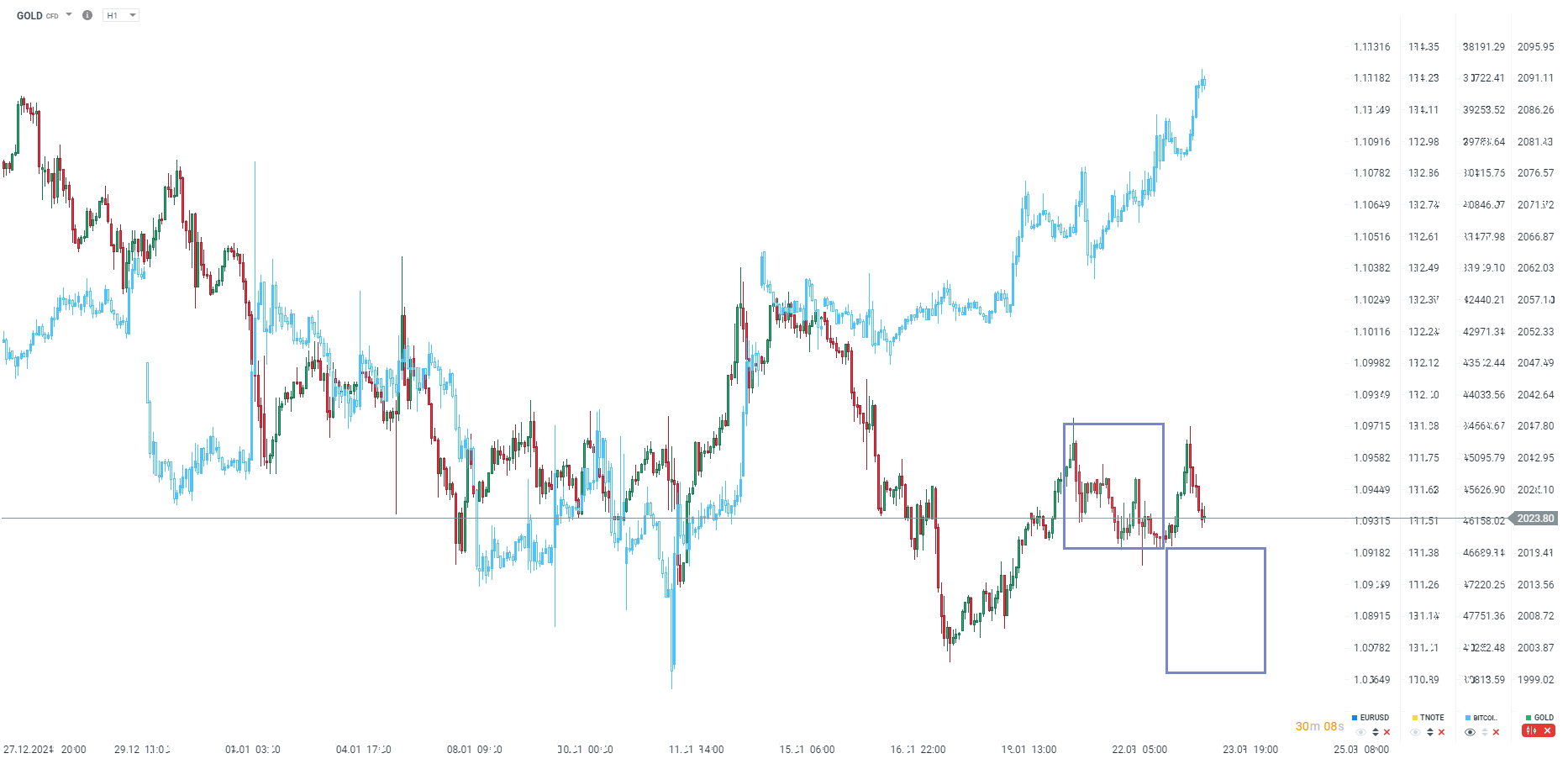 Zlato zostáva pod tlakom a od polovice mesiaca sa nedá pozorovať jeho pozitívna reakcia na pokles kurzu Bitcoinu. Z technického hľadiska môže zlato vytvoriť krátkodobú formáciu dvojitého vrcholu s cieľom v blízkosti 2 000 USD za uncu. Zdroj: xStation5