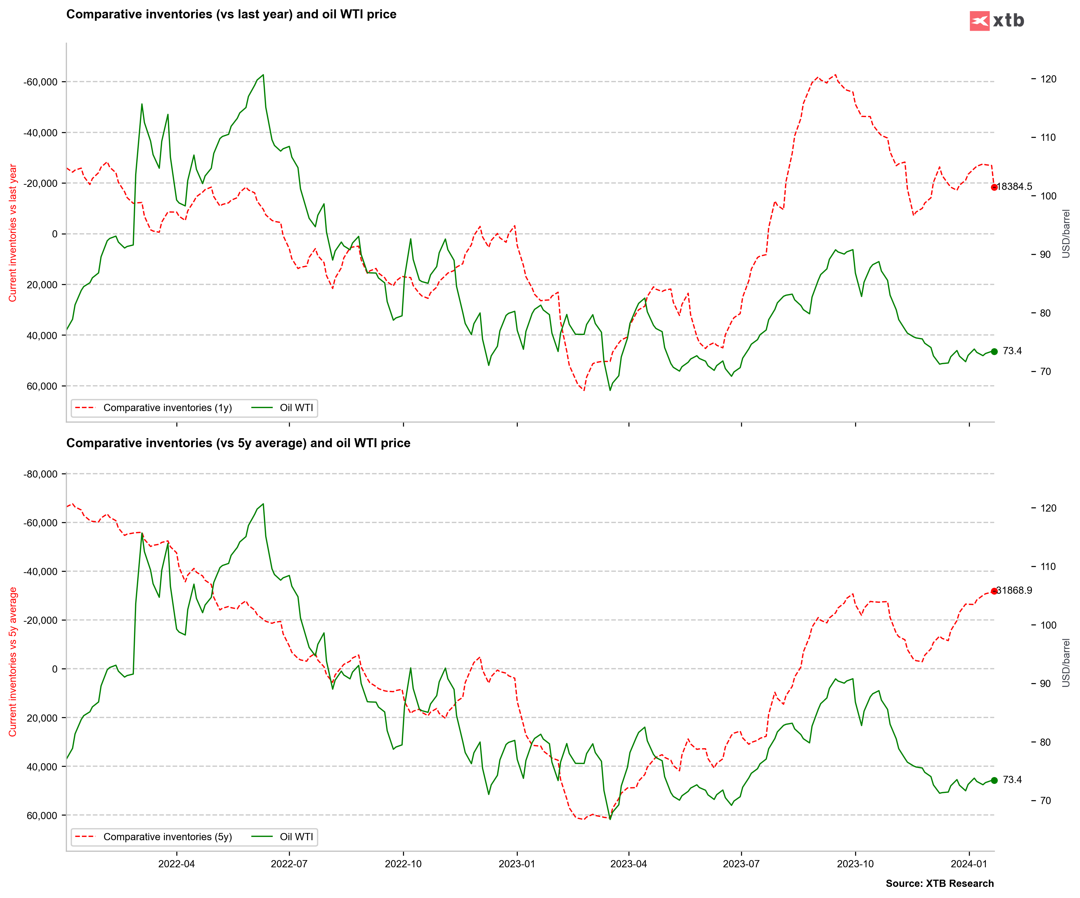 - Stojí za zmienku, že zásoby ropy v USA v porovnaní s 5-ročným priemerom (porovnávacie zásoby) klesli na najnižšiu úroveň od októbra, keď sa cena WTI pohybovala blízko úrovne 90 USD za barel. Súčasné zásoby v porovnaní so zásobami spred roka sú však zároveň mierne nižšie