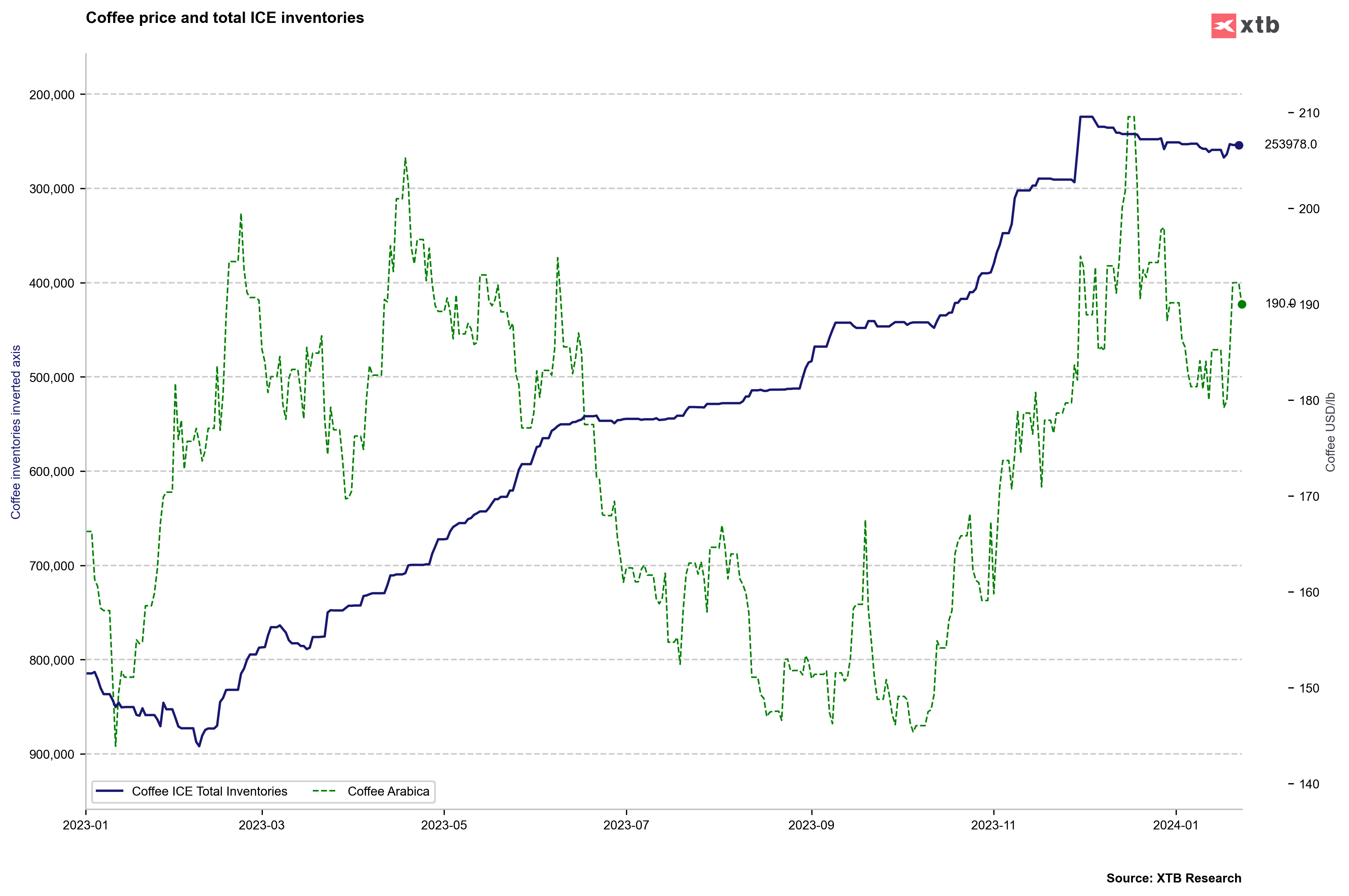 - Zásoby kávy na ICE sa postupne znižovali a zostávajú mimoriadne nízke, čo ukazuje, že zmeny vo vykazovaní zásob kávy situáciu výrazne nezmenili. Cena arabiky však po silnom odraze na začiatku tohto týždňa ustupuje