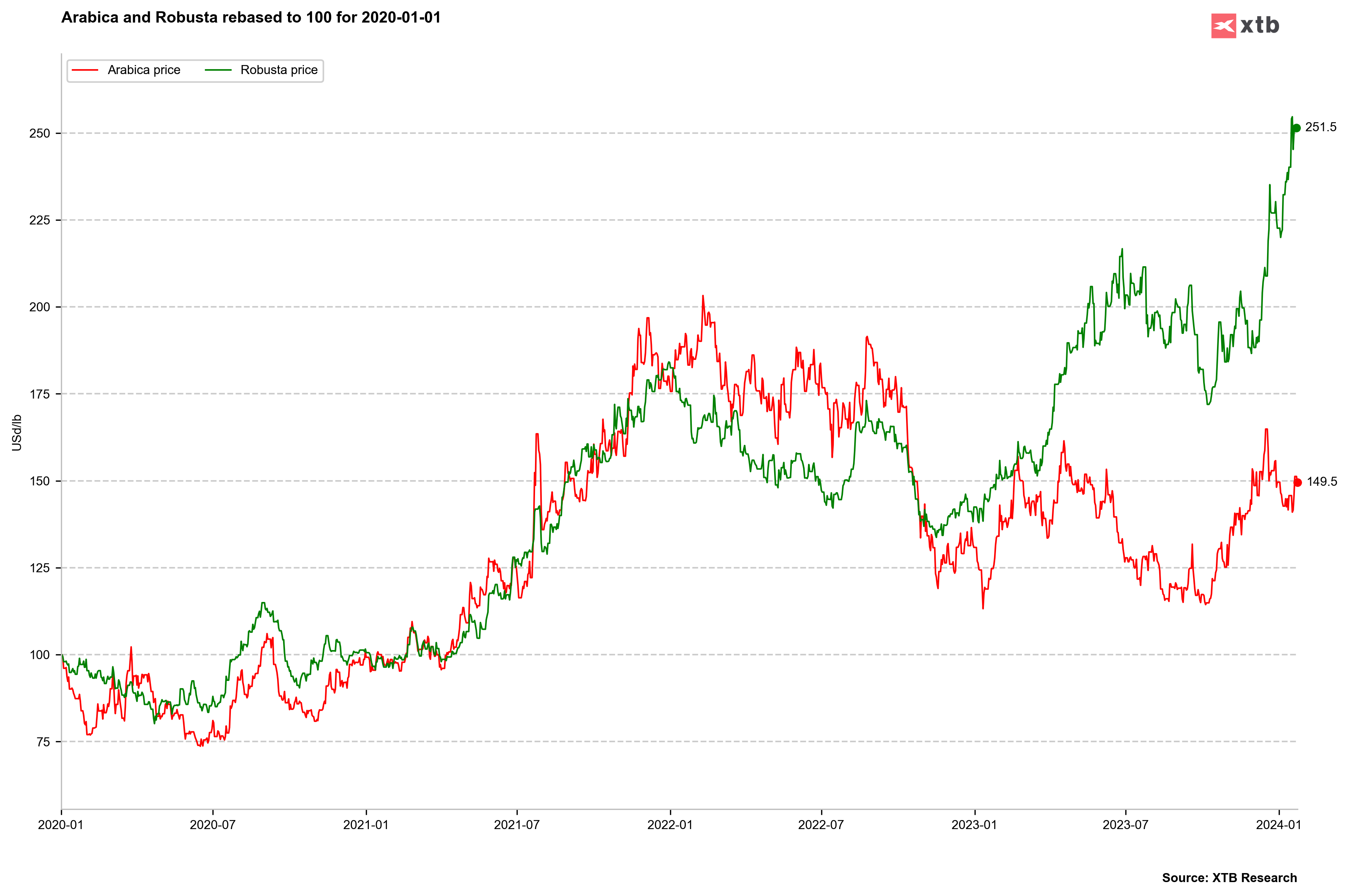 Cena Robusty koncom decembra a začiatkom januára výrazne rastie, zatiaľ čo Arabica zaostáva. Zdroj: Bloomberg Finance LP, XTB
