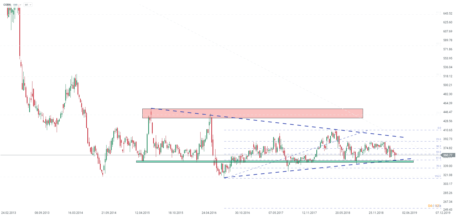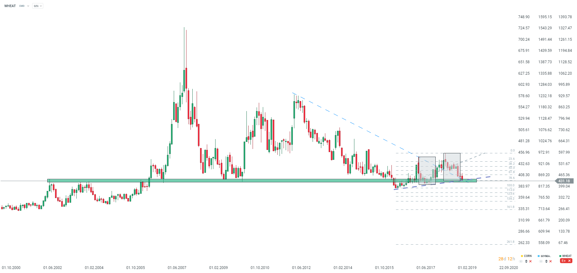 Ceny pšenice klesali na kľúčovú úroveň supportu, ktorá sa vyznačovala viacročnou dopytovou zónou. Zdroj: xStation5