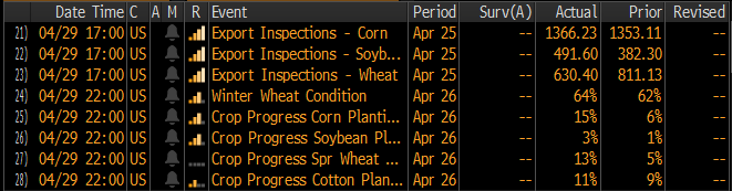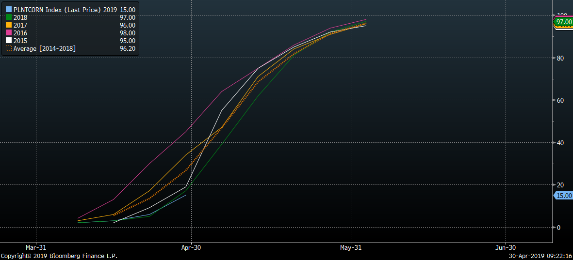 Sadenice kukurice sú v súlade s trendom, ale pod 5-ročným priemerom a pod hodnotami z minulého roka. Zdroj: Bloomberg