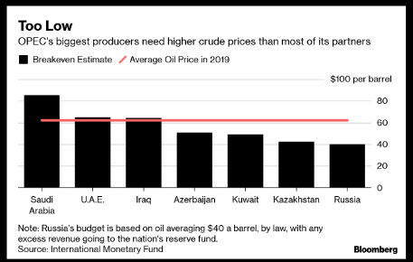 Saudská Arábia potrebuje k dosiahnutiu vyrovnaného rozpočtu cenu ropy vo výške 84 USD. Na druhej strane, Rusko potrebuje cenu 40 dolárov. Zdroj: Bloomberg