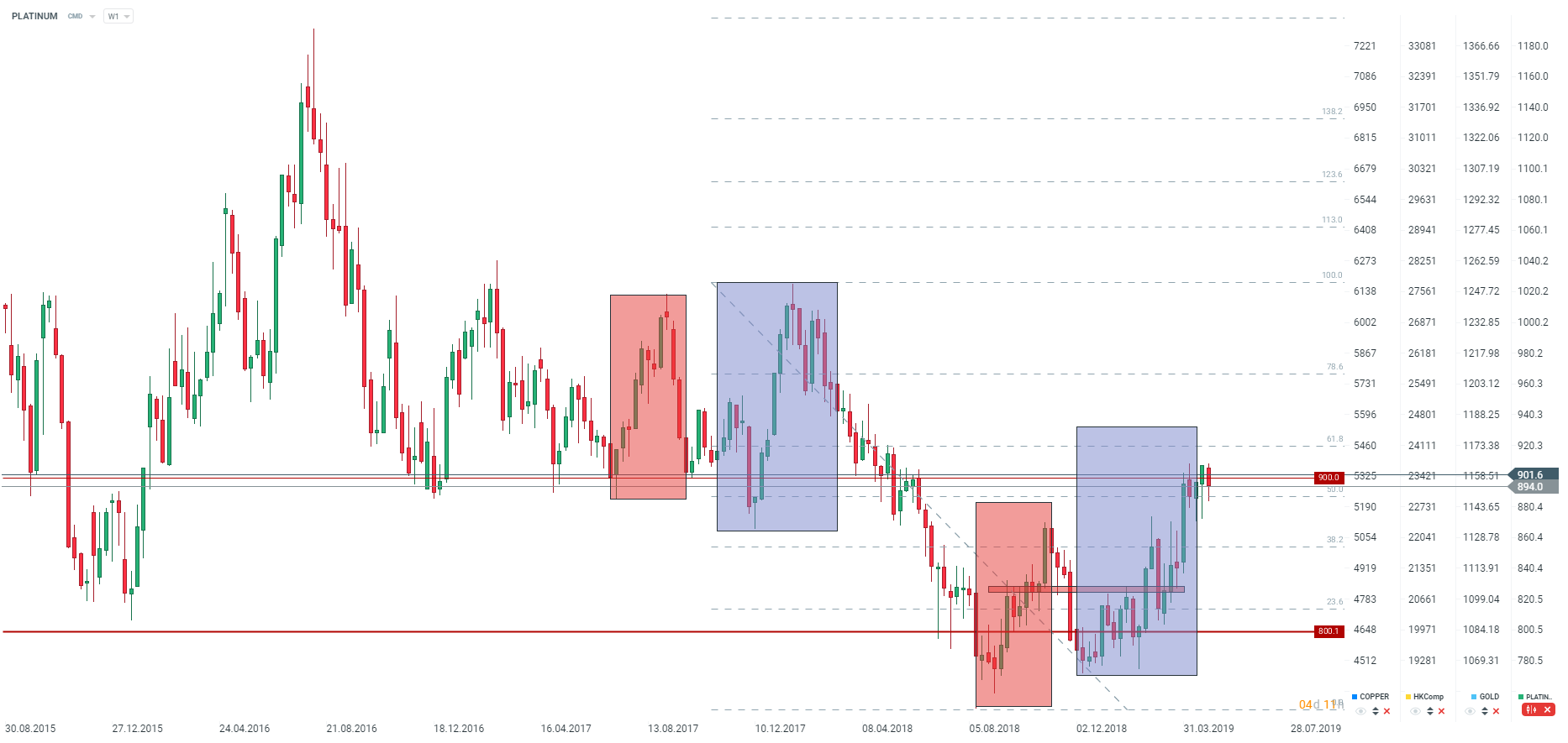 Platina sa obchoduje posledný mesiac okolo úrovne 900 USD. V tom istom období, zaznamenala cena zlata významnejší pokles. Na druhej strane, divergencia medzi zlatom a platinou sa uzavrela. Nižšia cena zlata by mohla podporiť dopyt po zlate v Indii. Zdroj: xStation5