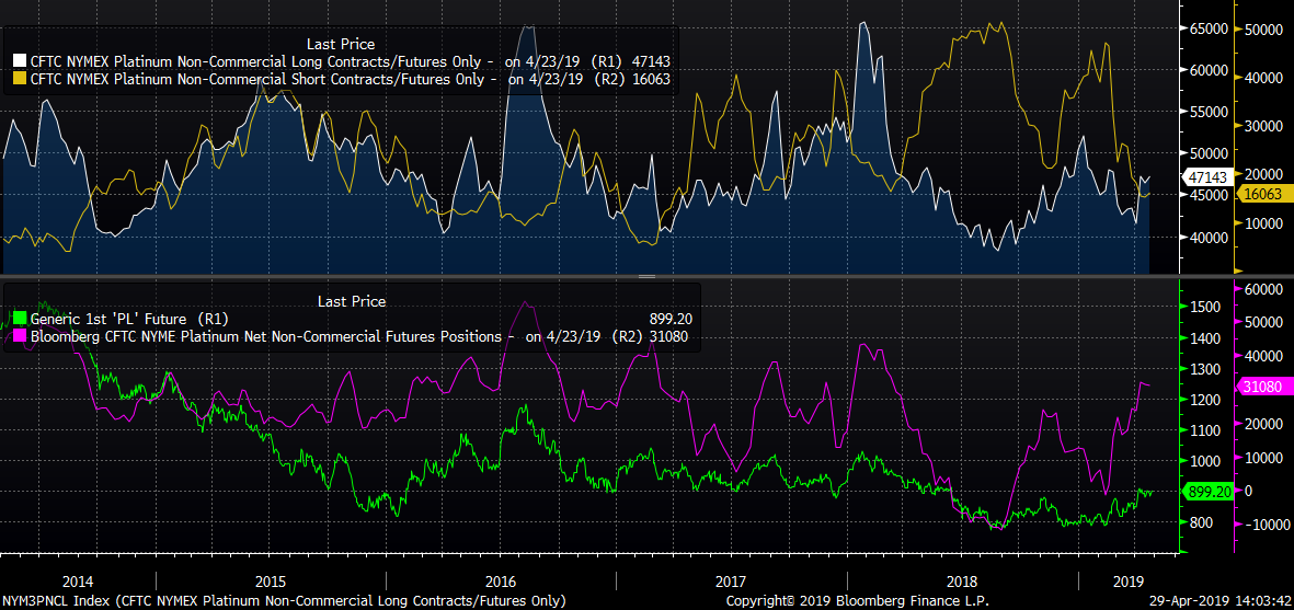 Čistá špekulatívna pozícia na platine je veľmi vysoká, najmä v dôsledku poklesu počtu krátkych pozícií. Zdroj: Bloomberg