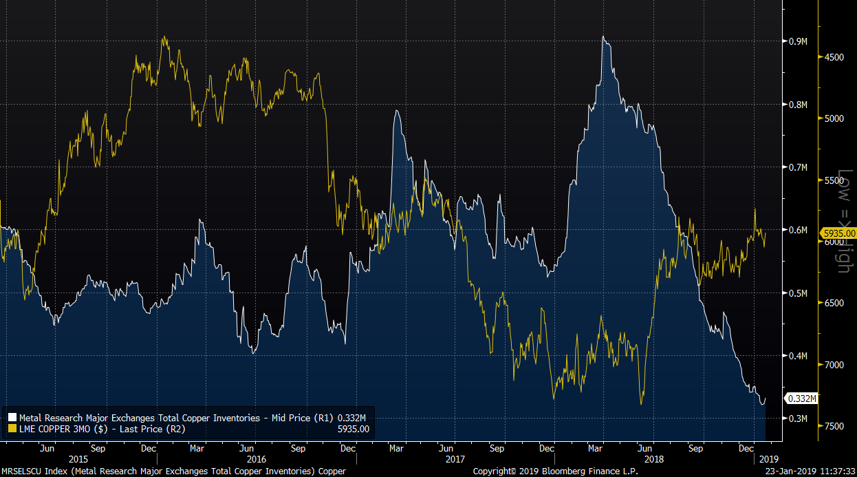 Zásoby mědi na komoditních burzách výrazně klesly v druhém pololetí minulého roku. Zdroj: Bloomberg