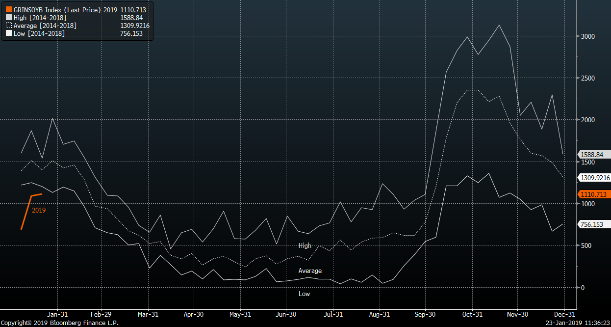 Exporty komodity začaly nový rok pod pětiletým průměrem, nicméně momentum je slibné. Zdroj: Bloomberg
