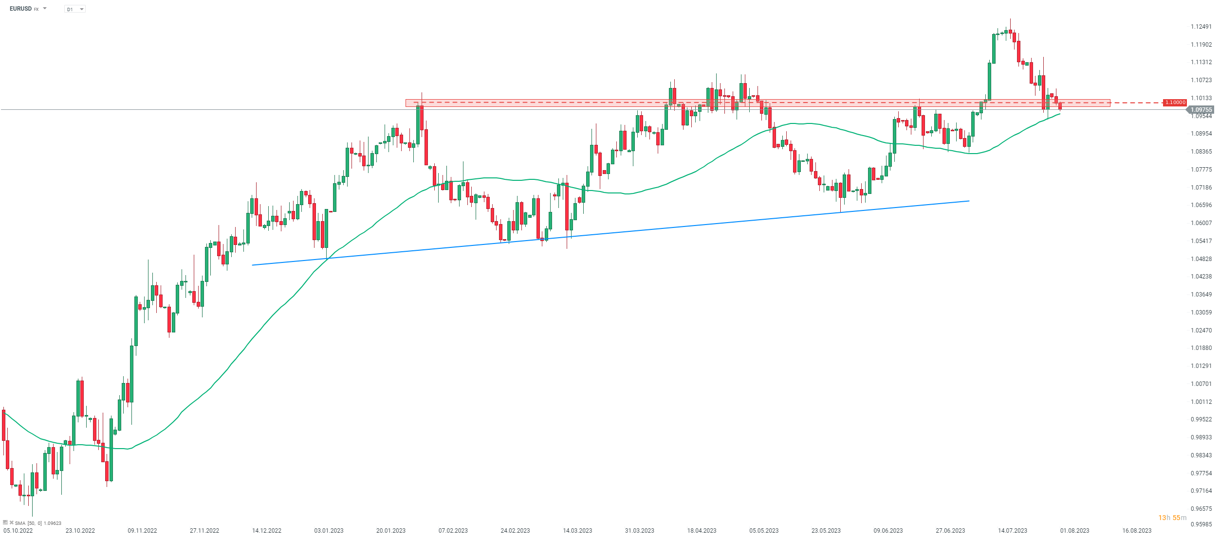 Zatiaľ čo EURUSD nezaznamenal žiadnu výraznejšiu reakciu na revízie PMI, pár dnes pomaly pokračuje v pohybe smerom nadol a prelomil zónu podpory 1,10. Zdroj: xStation5