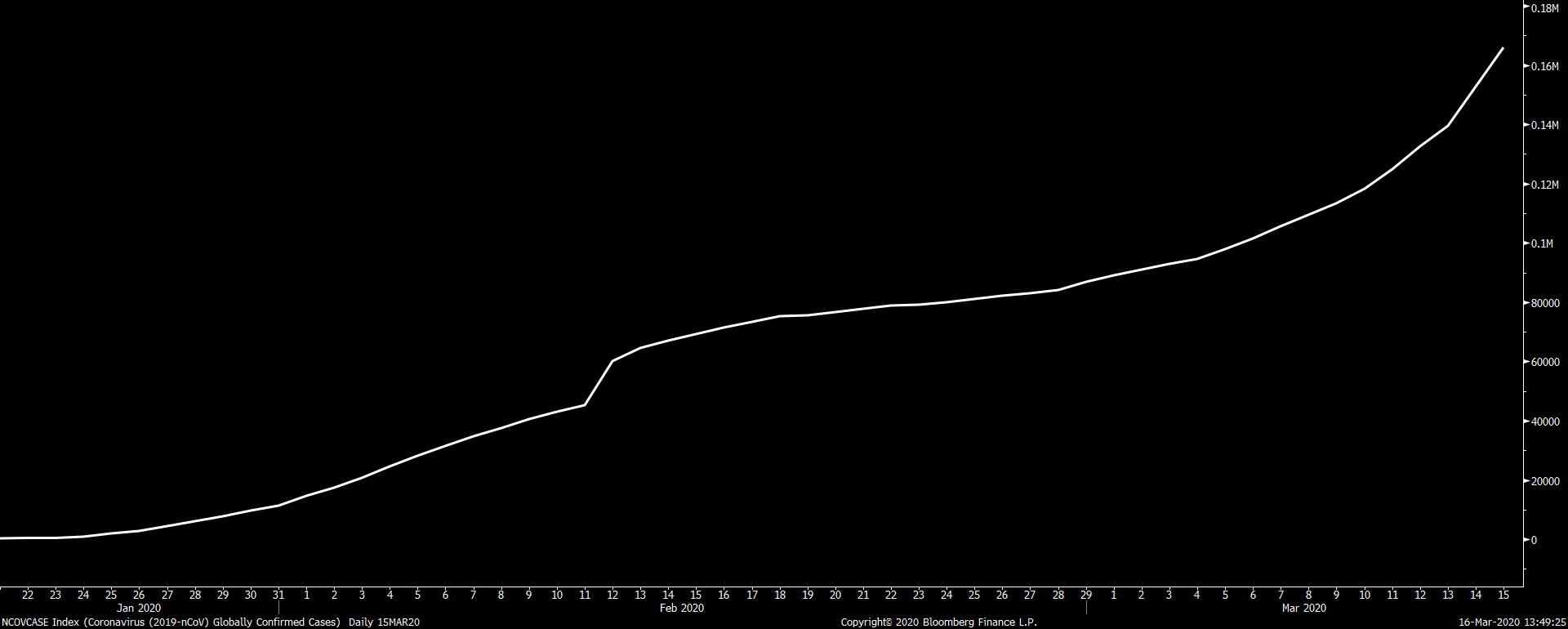 Počet lidí infikovaných novým koronavirem stále narůstá. Globální počet případů se dnes přiblížil 170 tisíc případů. Evropa je nyní epicentrem pandemie na čele s Itálií, kde se počet infikovaných (zjištěných) blíží 25 tisícům. Počet nových případů roste také ve Španělsku (7988), Německu (6215) a Francii (5423). Některé země jako Německo, Dánsko, Česká republika nebo Polsko se rozhodly uzavřít s některými výjimkami své hranice, aby zabránily šíření viru. Španělé následovali Itálii a vyhlásili karanténu. Situace má výrazný dopad na finanční trhy, které dnes pokračují v masivním propadu. Německý index DE30 (DAX30) klesl po 13. hodině až pod úroveň 8300 bodů.