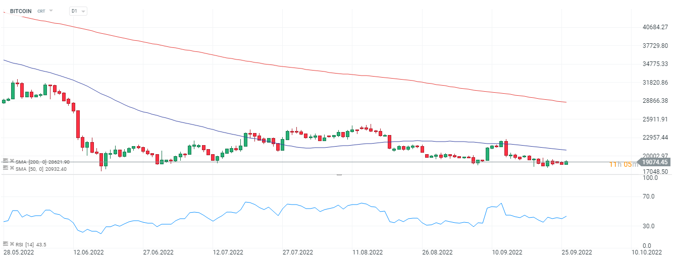 Bitcoin, interval D1. Bitcoin se stále pohybuje pod 200- a 50denním klouzavým průměrem, které jsou nyní hlavním krátkodobým a střednědobým odporem ceny. Prolomení kryptoměny nad 20 000 USD by mohlo být katalyzátorem pokusu o útok na oblast kolem 21 000 USD, kde běží SMA50, porážka průměru by mohla krátkodobě předzvěstí bezprostřední zvrat sestupného trendu. Dokud se kotace pohybují pod 20 000 USD, má nabídka stále navrch, futures na americké indexy ukazují na nižší otevření na Wall Street, což by mohlo dále snížit sentiment kryptotrhů. Zdroj: xStation5