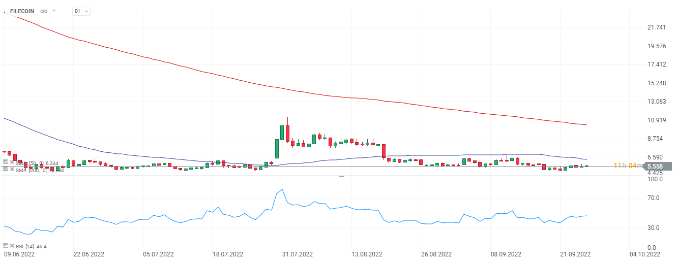 Filecoin, interval D1. Kryptoměna téměř úplně zakryla „mezera růstu“ vytvořená na začátku srpna, když tvůrci oznámili partnerství s Harvardskou univerzitou. Je vidět, že se RSI vzpamatovává z propadu do oblasti blízké přeprodanosti, nicméně na úrovně z června letošního roku se neusadil. Pokud kryptotrh zastaví poklesy, zakrytí mezery by se mohlo ukázat jako katalyzátor přílivu nové poptávky. Zdroj: xStation5