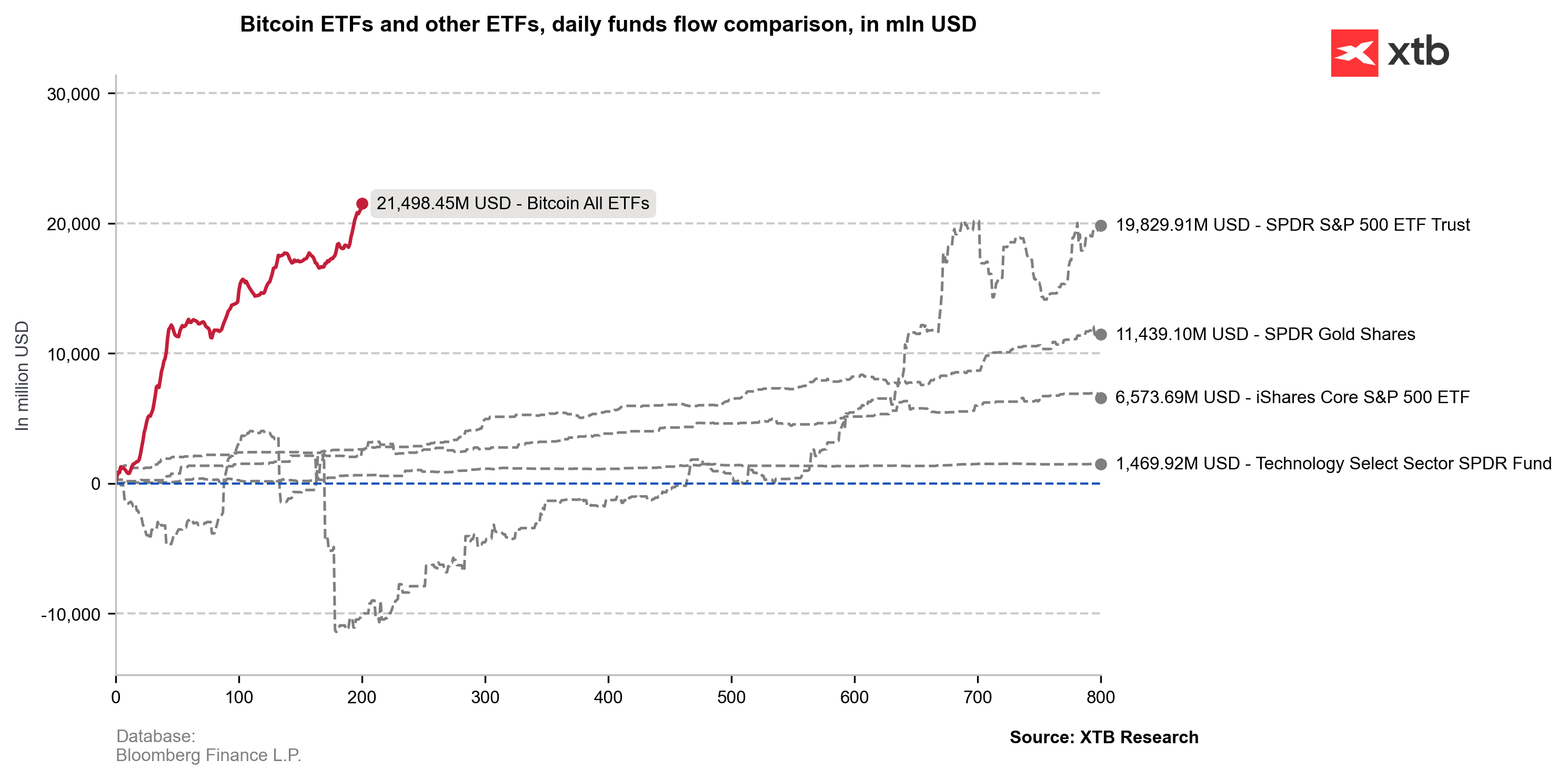 - Prítoky do Bitcoin ETF tento rok (viac než 21 miliárd USD) už prekonali SPDR S&P 500 Trust, iShares Core S&P 500, iShares Gold a ďalšie 'tradičné' vlajkové fondy obchodované na burze.
