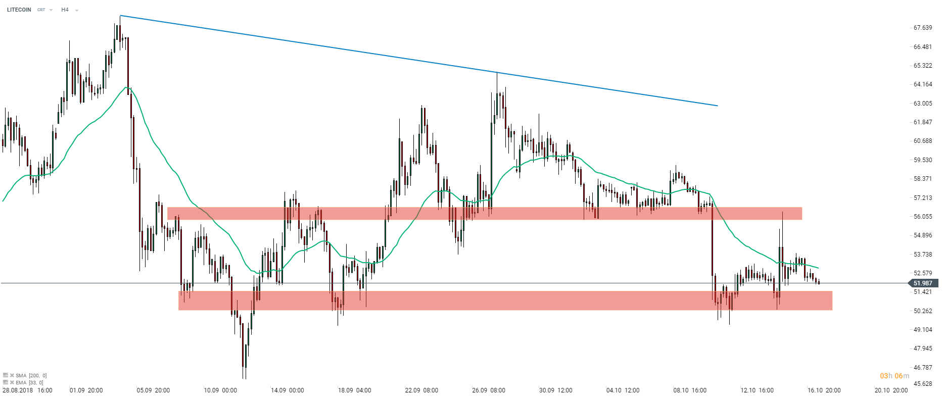 LITECOIN dnes dostal z celého trhu kryptoměn jeden z největších zásahů. Měna se obchoduje pod 33-období klouzavým průměrem (zelená křivka) a mohla by být dotlačena až do zóny supportu mezi $50,3-51,5 dolarů v blízké budoucnosti. Zdroj: xStation5