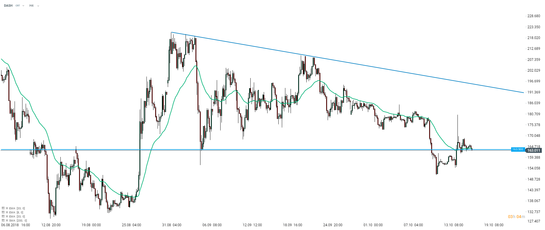 Po posledním rychlém vzestupu Dash velmi rychle korigoval až na významnou úroveň v okolí 163.50 dolarů. Pokud se této kryptoměně podaří tuto úroveň opět, tak odraz ke klesající trendové čáře by měl být opět blíže. Zdroj: xStation5