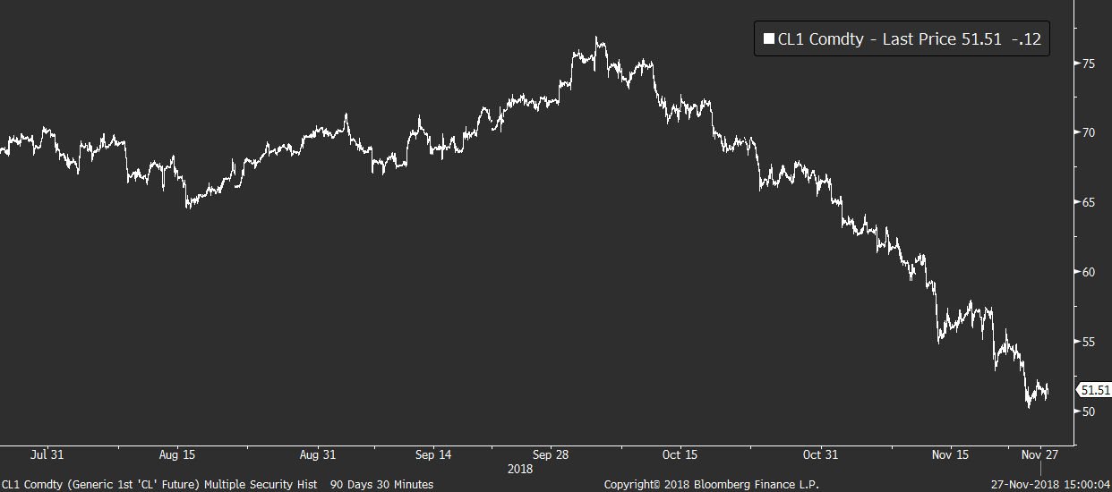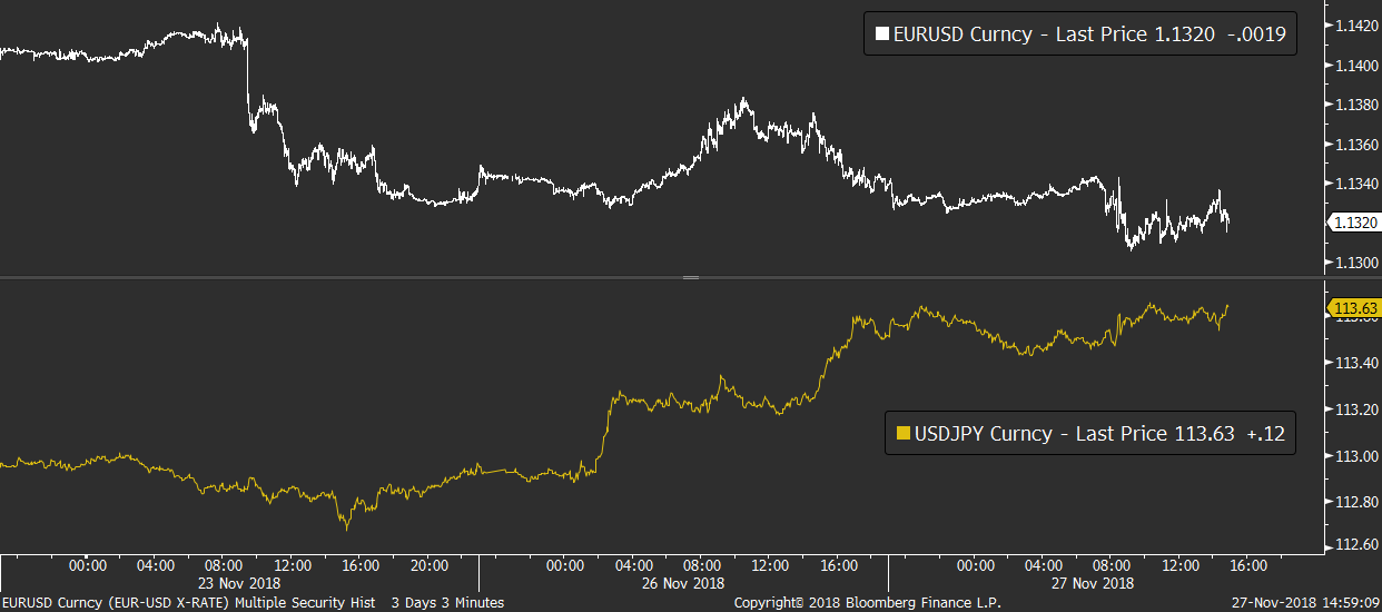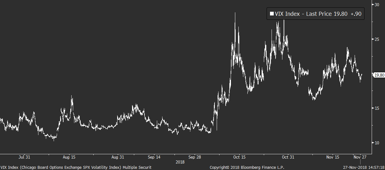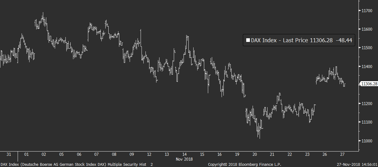 Díky absenci makra se opět mluví hlavně o politických rizicích spojených s Itálií, brexitem a americko-čínskými obchodními vztahy. Ty čeká klíčová zkouška koncem týdne, kdy se setkají americký a čínský prezident za účelem sjednání podmínek vzájemného obchodu.