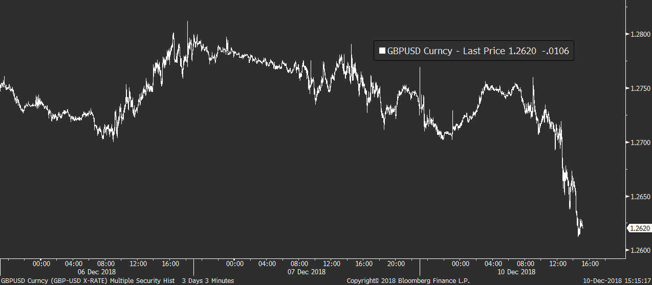 Hlavním tématem pondělní seance se zdá být dění v Británii, kde podle posledních zpráv rozhodla Theresa Mayová o pozdržení hlasování o brexitu, které mělo proběhnout už zítra večer. To vysílá investorům jasný signál, že britská premiérka nevěří, že by byla schopná zítra hlasování vyhrát, což dnes začíná znovu negativně doléhat na libru, která ztrácí na všech hlavních měnových párech. Na páru s dolarem libra klesá o necelé procento a propadá se až na dosah 1,26 GBPUSD, kde se naposledy pohybovala v dubnu loňského roku. Nijak ji přitom nepomohly ani dnešní výsledky průmyslové produkce, která klesla meziměsíčně o 0,6 %, což byl ještě o dvě desetiny horší výsledek, než s čím počítal většinový konsenzus.
