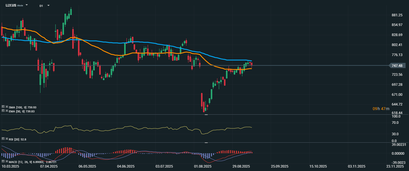 Akcie spoločnosti Eli Lilly sa aktuálne obchodujú na úrovni 747,48 USD, čo znamená, že sa cena priblížila k dôležitému technickému odporu v podobe SMA 100 (759,93 USD). Zároveň sa drží mierne nad EMA 50 (739,83 USD), ktorá momentálne funguje ako krátkodobá podpora.