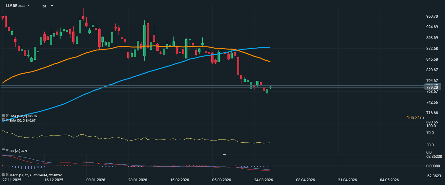 Akcie spoločnosti Eli Lilly sa obchodujú okolo 779,20 EUR a v posledných týždňoch zostávajú pod výrazným predajným tlakom. Cena sa nachádza pod oboma kĺzavými priemermi, konkrétne pod EMA 50 na úrovni 840,67 EUR aj pod SMA 100 na úrovni 875,02 EUR, čo potvrdzuje pokračujúci medvedí trend. Negatívne pôsobí aj fakt, že po prudšom poklese zatiaľ neprichádza výraznejší odraz a titul sa drží blízko lokálnych miním. RSI sa pohybuje na hodnote 37,9, čo ukazuje na slabnúce momentum a zvýšený tlak predávajúcich, trh sa však zatiaľ stále nenachádza v jasne prepredanej zóne. MACD zostáva v zápornom teritóriu a drží sa pod signálnou líniou, čím potvrdzuje negatívne krátkodobé nastavenie. Z technického pohľadu tak akcie zatiaľ nevysielajú silnejší signál obratu a vývoj skôr naznačuje pokračujúcu opatrnosť investorov.