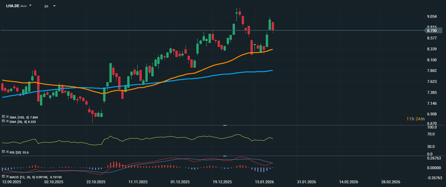 Akcie spoločnosti Lufthansa sa obchodujú okolo úrovne 8,75 EUR, pričom v posledných dňoch došlo k výraznému rastu po predchádzajúcej korekcii. Cena sa odrazila od kĺzavého priemeru EMA 50 (8,33 EUR), ktorý aktuálne slúži ako krátkodobá podpora. Dlhodobejší priemer SMA 100 sa nachádza na úrovni 7,87 EUR a ukazuje na stabilný rastový trend od októbra 2025. RSI sa pohybuje na úrovni 55,6, teda v neutrálnej zóne, čo naznačuje, že cena má priestor na ďalší rast bez rizika prekúpenosti. Z pohľadu technickej analýzy pôsobí odraz od EMA 50 ako potvrdenie záujmu kupujúcich a môže byť impulzom na otestovanie lokálnej rezistencie v oblasti 8,90–9,05 EUR. Naopak, najbližšiu podporu možno hľadať práve na úrovni EMA 50, prípadne nižšie, okolo úrovne 8,10 EUR, kde predtým došlo ku konsolidácii.