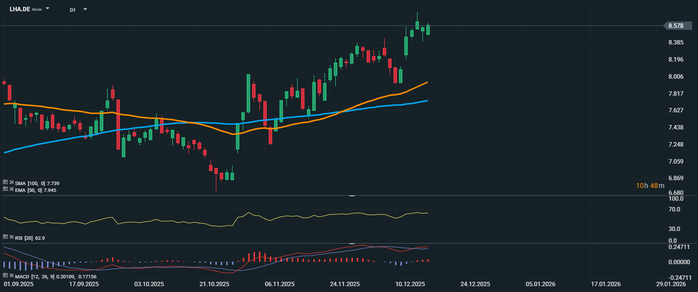 Akcie spoločnosti Lufthansa sa obchodujú na úrovni 8,578 EUR, čo predstavuje najvyššie hodnoty od augusta 2025. Cena sa stabilne pohybuje nad kĺzavými priemermi, pričom EMA 50 je na 7,945 EUR a SMA 100 na 7,739 EUR. Táto konfigurácia potvrdzuje silné býčie nastavenie. RSI dosahuje hodnotu 62,9, čo signalizuje zvýšený nákupný záujem, no stále sa nachádza pod úrovňou prekúpenia. Po predchádzajúcej krátkej korekcii sa cena odrazila od EMA 50 a pokračuje v rastúcom trendeNajbližšou rezistenciou je psychologická úroveň 8,60 EUR, zatiaľ čo dôležitú podporu tvorí pásmo 7,95–8,00 EUR, kde sa nachádza EMA 50.