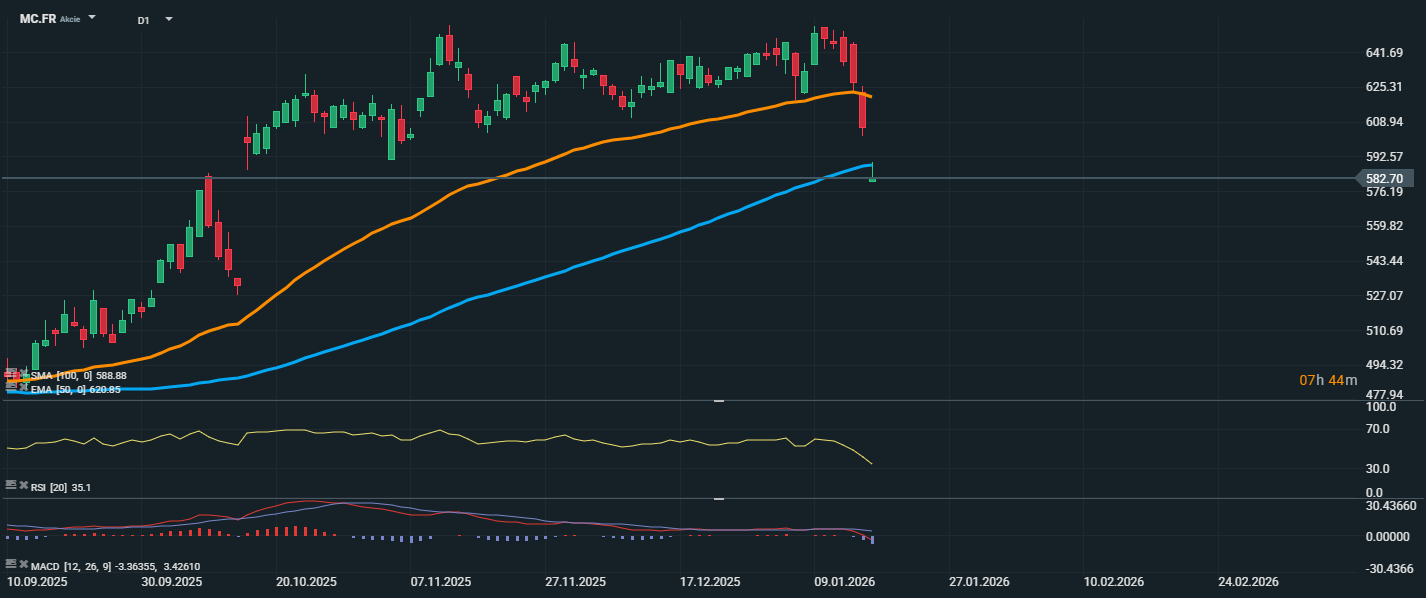 Akcie spoločnosti LVMH (Moët Hennessy Louis Vuitton) zaznamenali prudký pokles a aktuálne sa obchodujú na úrovni 582,70 EUR, čím prerazili pod kĺzavý priemer EMA 50 (620,85 EUR) a SMA 100 (588,88 EUR). Tento technický prieraz je negatívnym signálom a značí možný prechod do korekčnej fázy po dlhšej konsolidácii. RSI (35,1) sa posunul blízko prepredanej zóny, čo potvrdzuje zosilňujúci predajný tlak, ale zároveň naznačuje, že akcie sa môžu krátkodobo nachádzať v oblasti možného odrazu.