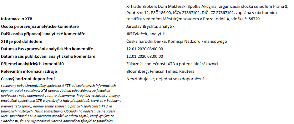Tento materiál je marketingovou komunikáciou v zmysle čl. 24 ods. 3 smernice Európskeho parlamentu a Rady 2014/65/EÚ z 15. mája 2014 o trhoch s finančnými nástrojmi, ktorou sa mení smernica 2002/92/ES a smernica 2011/61/EÚ (MiFID II). Marketingová komunikácia nie je investičným odporúčaním ani informáciou odporúčajúcou alebo navrhujúcou investičnú stratégiu v zmysle nariadenia Európskeho parlamentu a Rady (EÚ) č. 596/2014 zo 16. apríla 2014 o zneužívaní trhu (nariadenie o zneužívaní trhu) a o zrušení smernice Európskeho parlamentu a Rady 2003/6/ES a smerníc Komisie 2003/124/ES, 2003/125/ES a 2004/72/ES a delegovaného nariadenia Komisie (EÚ) 2016/958 z 9. marca 2016, ktorým sa dopĺňa nariadenie Európskeho parlamentu a Rady (EÚ) č. 596/2014, pokiaľ ide o regulačné technické predpisy upravujúce technické opatrenia na objektívnu prezentáciu investičných odporúčaní alebo iných informácií, ktorými sa odporúča alebo navrhuje investičná stratégia, a na zverejňovanie osobitných záujmov alebo uvádzanie konfliktov záujmov v zmysle zákona č. 566/2001 Z. z. o cenných papieroch a investičných službách. Marketingová komunikácia je pripravená s najvyššou starostlivosťou, objektivitou, prezentuje fakty známe autorovi k dátumu prípravy a neobsahuje žiadne hodnotiace prvky. Marketingová komunikácia je pripravená bez zohľadnenia potrieb klienta, jeho individuálnej finančnej situácie a nijakým spôsobom nepredstavuje investičnú stratégiu. Marketingová komunikácia nepredstavuje ponuku na predaj, ponuku, predplatné, výzvu na nákup, reklamu alebo propagáciu akýchkoľvek finančných nástrojov. XTB S.A. organizačná zložka nezodpovedá za žiadne kroky alebo opomenutia klienta, najmä za nadobudnutie alebo predaj finančných nástrojov. XTB nezodpovedá za žiadnu stratu alebo škodu, vrátane, bez obmedzenia, akejkoľvek straty, ktorá môže vzniknúť priamo alebo nepriamo, spôsobená na základe informácií obsiahnutých v tejto marketingovej komunikácii. V prípade, že marketingová komunikácia obsahuje akékoľvek informácie o akýchkoľvek výsledkoch týkajúcich sa finančných nástrojov v nej uvedených, nepredstavujú žiadnu záruku ani prognózu budúcich výsledkov. Minulá výkonnosť nemusí nevyhnutne naznačovať budúce výsledky a každá osoba konajúca na základe týchto informácií tak robí výlučne na vlastné riziko.