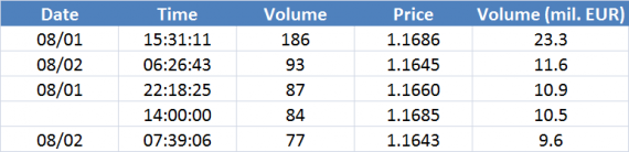 Největší obchody podle objemu na EURUSD (aktivní future kontrakt):