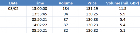 Největší obchody podle objemu na GBPUSD (aktivní future kontrakt):