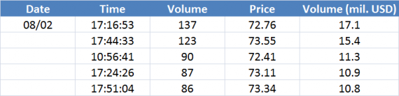 Největší obchody podle objemu na Brent (aktivní future kontrakt)