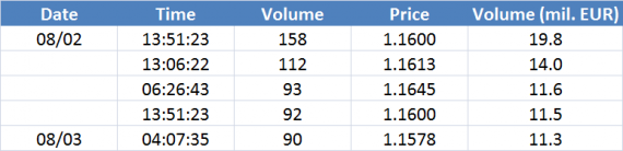 Největší obchody podle objemu na EURUSD (aktivní future kontrakt):