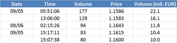 Největší obchody podle objemu na EURUSD (aktivní future kontrakt):