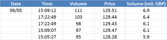 Největší obchody podle objemu na GBPUSD (aktivní future kontrakt):