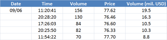 Největší obchody podle objemu na Brent (aktivní future kontrakt)