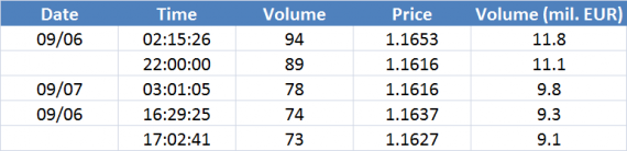 Největší obchody podle objemu na EURUSD (aktivní future kontrakt):